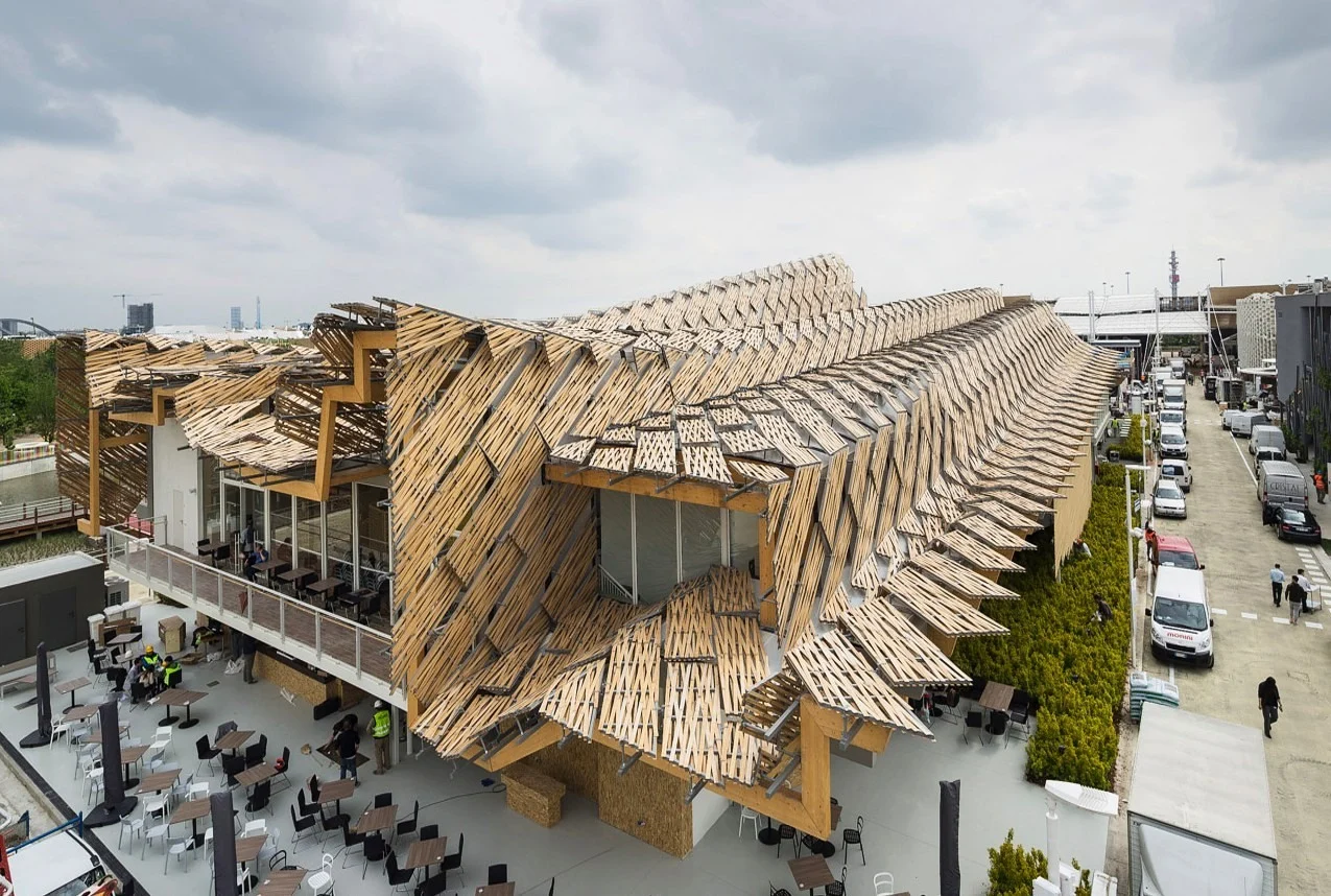 Chủ đề cho gian hàng Trung Quốc là “Miền đất hy vọng”. Dự án thể hiện điều này thông qua hình dạng mái nhà uốn lượn, được tạo ra bằng cách kết hợp hồ sơ của một đường chân trời thành phố ở phía bắc của tòa nhà với hồ sơ của một cảnh quan ở phía nam, thể hiện ý tưởng rằng “hy vọng” có thể được thực hiện khi thành phố và thiên nhiên tồn tại hài hòa. Được hình thành như một cấu trúc gỗ tham chiếu đến hệ thống “đòn nâng” được tìm thấy trong kiến trúc truyền thống Trung Quốc, mái nhà gian hàng cũng sử dụng công nghệ hiện đại để tạo ra những nhịp dài phù hợp với bản chất công cộng của tòa nhà. Mái nhà được phủ bằng các tấm lợp tham chiếu đến xây dựng mái nhà gốm truyền thống, nhưng được diễn giải lại như những chiếc lá tre lớn làm tăng hồ sơ mái nhà đồng thời che nắng cho các không gian công cộng bên dưới. Được thiết kế như những màn hình lớp, những tấm này tăng thêm kết cấu và chiều sâu cho mái nhà gian hàng và tạo ra những hiệu ứng ánh sáng và trong suốt đầy ấn tượng bên dưới.