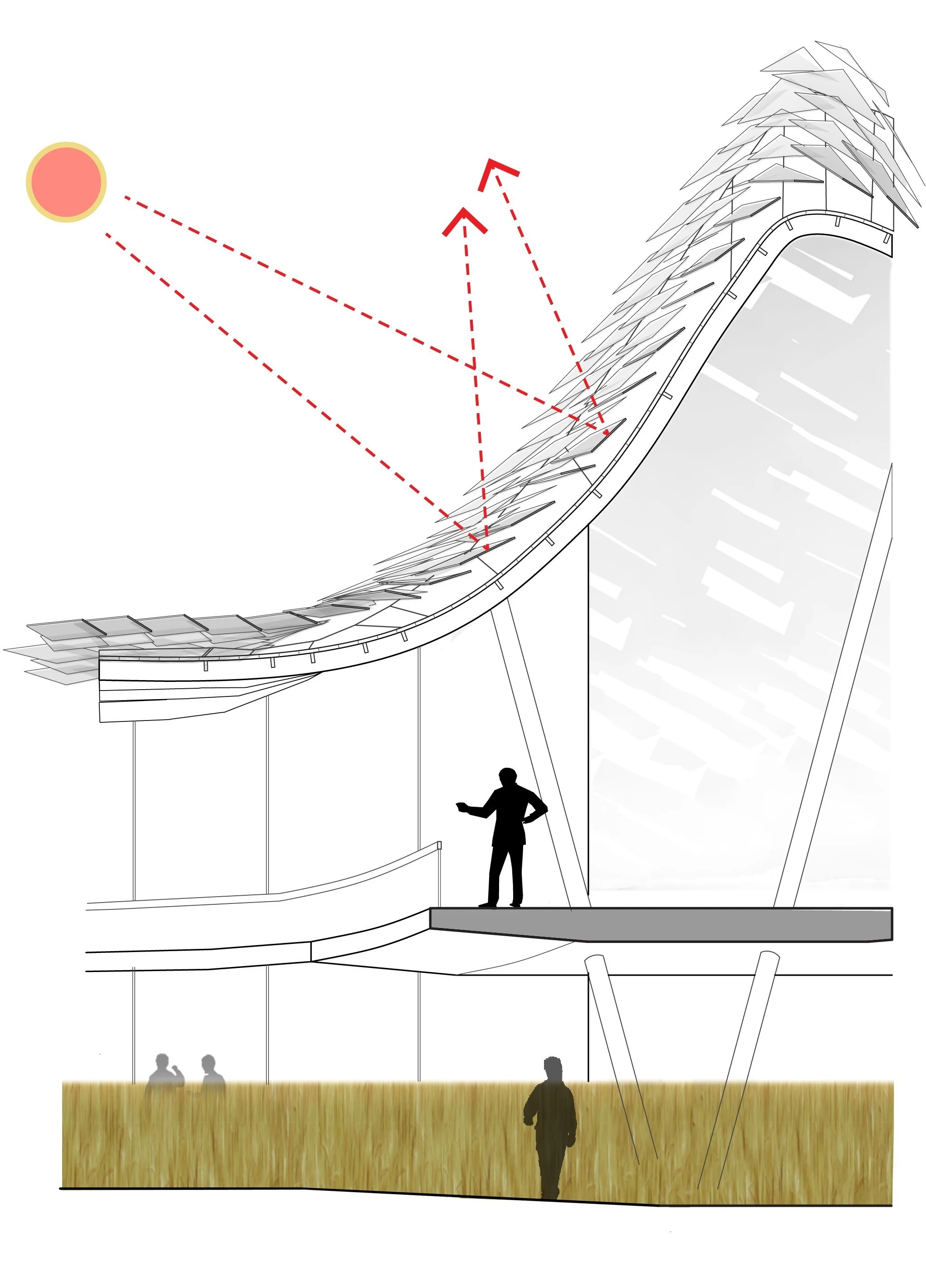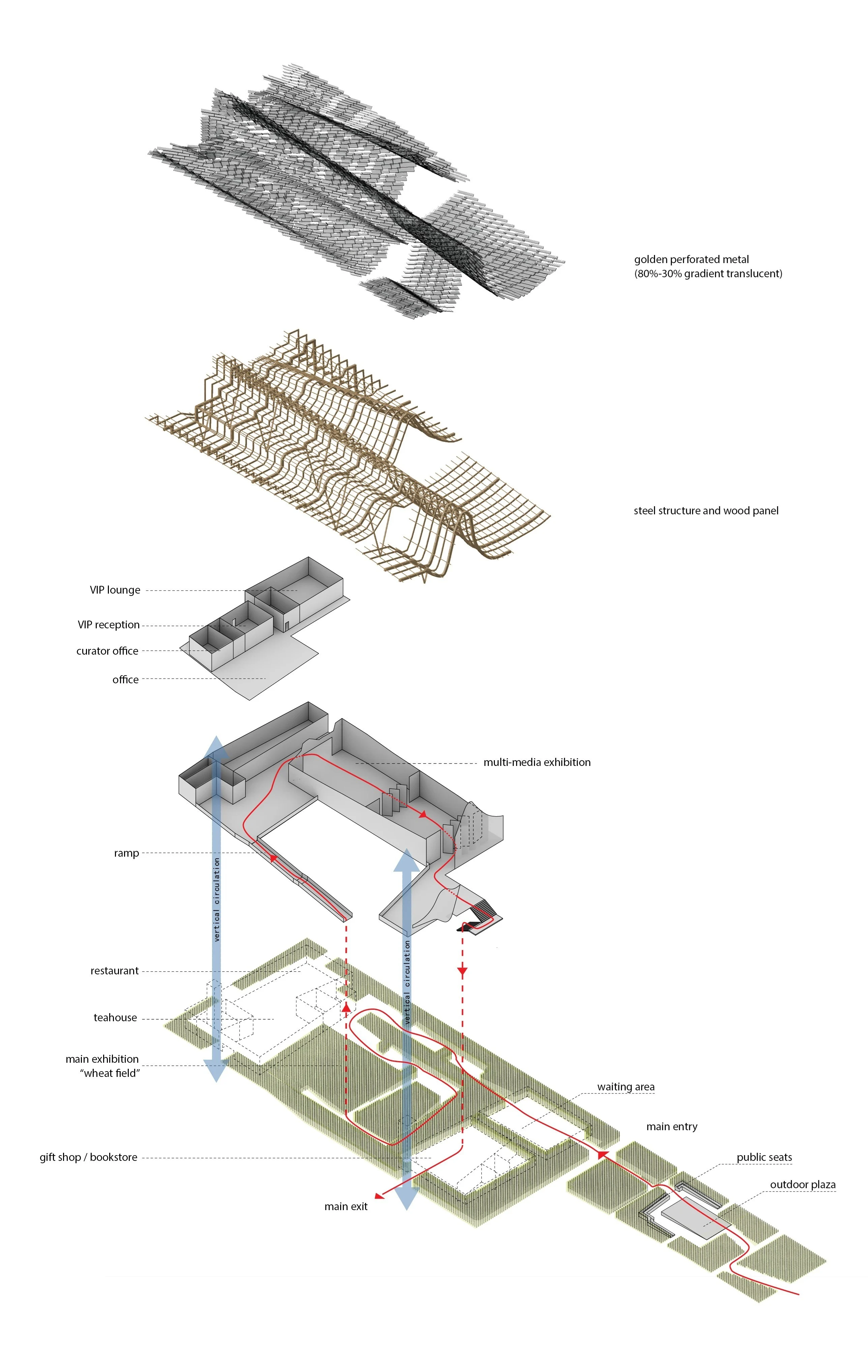 Dưới mái nhà, mặt đất của tòa nhà được định nghĩa bởi một cảnh quan lúa mì (miền đất hy vọng) tham chiếu đến quá khứ nông nghiệp của Trung Quốc. Cảnh quan tự nhiên này chuyển tiếp một cách liền mạch sang một lắp đặt đa phương tiện LED ở trung tâm tạo thành trung tâm của chương trình triển lãm của tòa nhà.