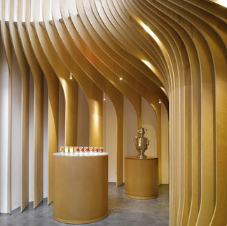 Các thanh gỗ riêng lẻ được làm từ Multiplex, dày 21mm, với lớp veneer gỗ cây liễu chất lượng “BB”. Hệ thống sàn được hoàn thiện bằng lớp microtopping màu than anthracite. Nội thất được bổ sung bởi các hình dáng đơn giản của nội thất, bao gồm hai bàn trình bày được làm từ MDF.