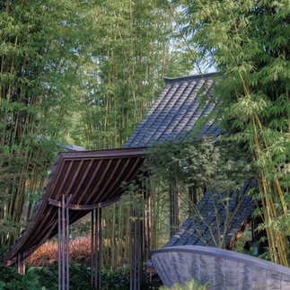 Sự kết hợp giữa tre, nước, ánh sáng và mái cong tạo nên cảm giác nhẹ nhàng và thi vị. Công trình giống như một khoảnh khắc kiến trúc trôi nổi giữa khu vườn, nơi người xem có thể cảm nhận sự giao thoa giữa truyền thống cảnh quan Tứ Xuyên và ngôn ngữ thiết kế đương đại.